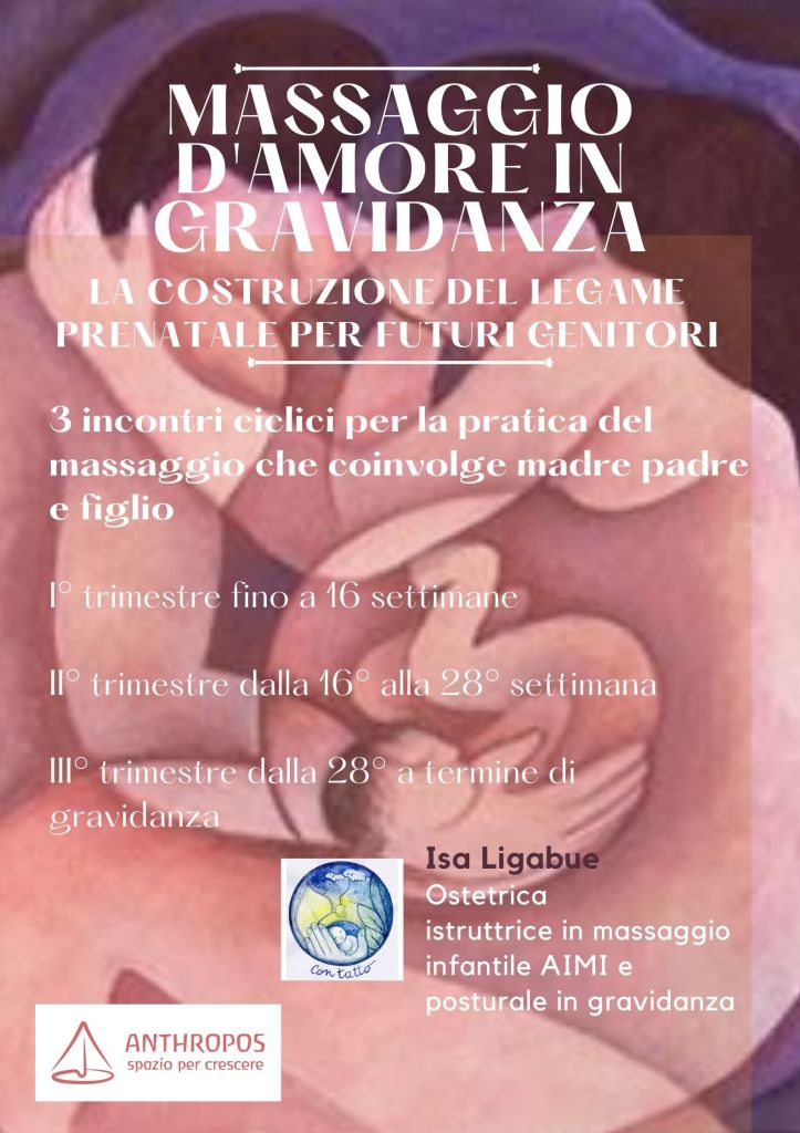 Isa propone il massaggio d’amore in gravidanza in quanto è un arricchimento della vita dei genitori e del loro bambino e una straordinaria esperienza di contatto prima della nascita, e la ginnastica posturale per seguire progressivamente le modificazioni del corpo con l’evolversi della gravidanza.